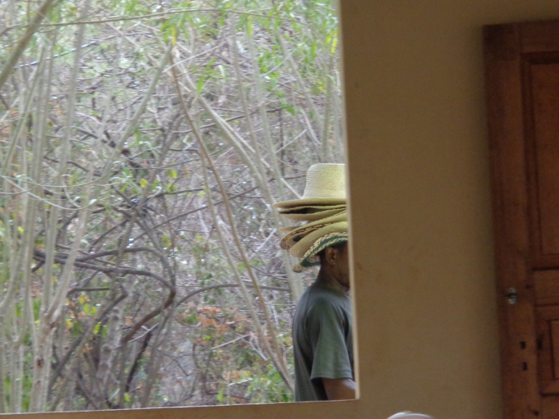 Local vendor selling straw hats at breakfast at local restaurant in Shimoni before sailing to Kisite-Mpunguti National Marine Park