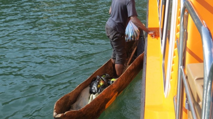 Sailing on Kivu Queen on Lake Kivu from Goma to Bukavu. A local fisher on his pirogue sells fish and fruit to travellers. Copyright Rupi Mangat (800×450)