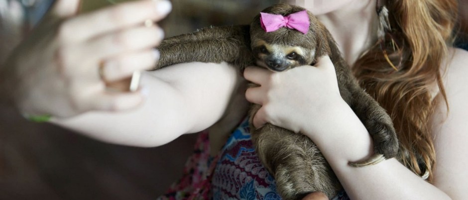 Above: Cruel taste – a sloth dressed in pink bow with a tourist. Wath the horrendous clip below on how the sloths are captured and put in sacks to be sold in the tourist trade